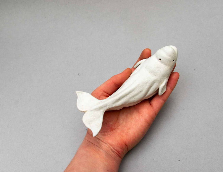Here are a few examples of the beluga whales I have made. They are finished with a white glaze, however I sometimes make mini-versions of them which are sponged with porcelain slip, giving them a matt finish and a slightly more rough texture. I also make sets of adults with their calfs.